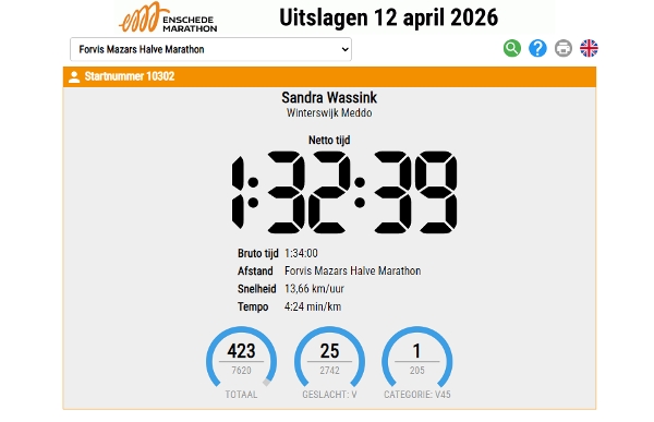 Sandra liep de halve marathon in Enschede. Ze werd 1e bij de vrouwen boven de 45 jaar.